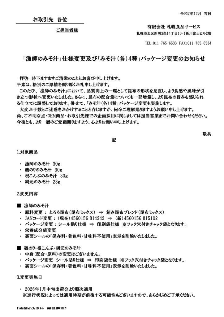 弊社商品「漁師のみそ汁」仕様変更及び「みそ汁4種」パッケージ変更のお知らせ