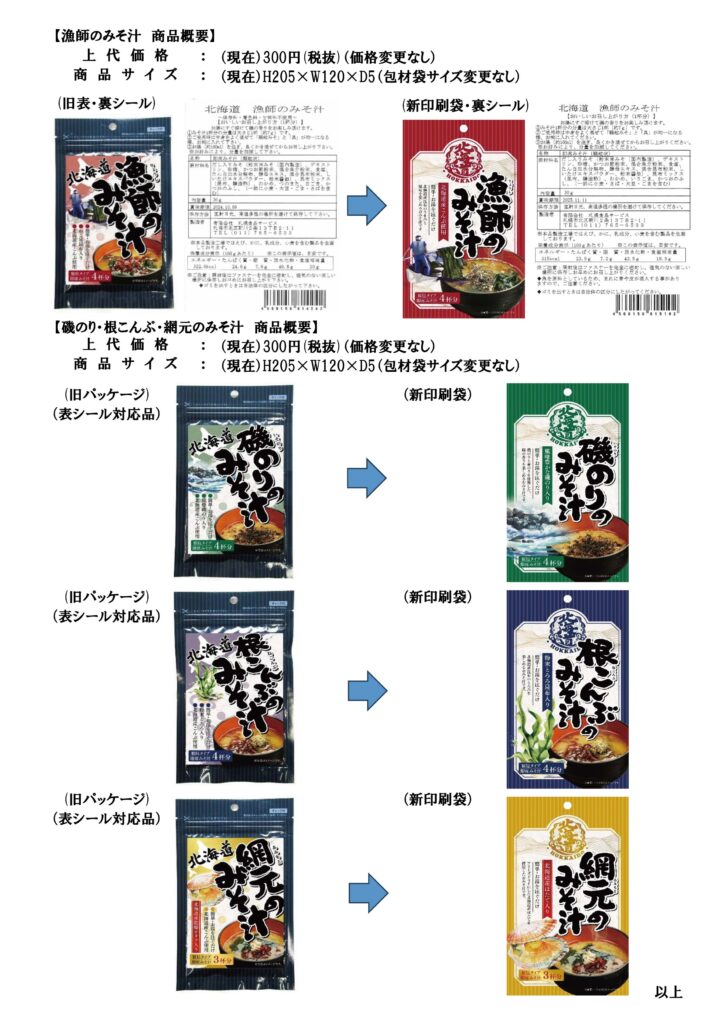 弊社商品「漁師のみそ汁」仕様変更及び「みそ汁4種」のパッケージ変更をご案内させて頂きます。